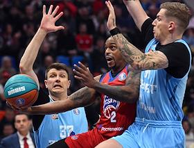 Единая лига ВТБ по баскетболу. Матч между командами ЦСКА (Москва) - "Зенит" (Санкт-Петербург) на стадионе "Мегаспорт". Игрок команды "Зенит" Георгий Жбанов (справа) и игрок команды ЦСКА Мело Тримбл (в центре) во время матча.