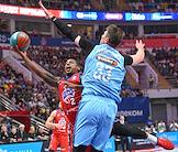 Единая лига ВТБ по баскетболу. Матч между командами ЦСКА (Москва) - "Зенит" (Санкт-Петербург) на стадионе "Мегаспорт". Игрок команды "Зенит" Ливай Рэндольф (левее) и игрок команды ЦСКА Каспер Уэйр (правее) во время матча.