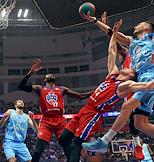 Единая лига ВТБ по баскетболу. Матч между командами ЦСКА (Москва) - "Зенит" (Санкт-Петербург) на стадионе "Мегаспорт". Игрок команды ЦСКА Ливио Жан-Шарль (второй слева) и игрок команды "Зенит" Андрей Мартюк (справа) во время матча.