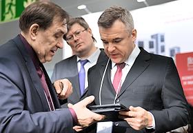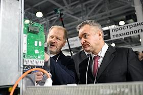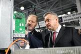 IV Международная выставка-форум "Электроника России" в МВЦ "Крокус Экспо". Заместитель министра промышленности и торговли России Василий Шпак (справа) во время посещения выставки.