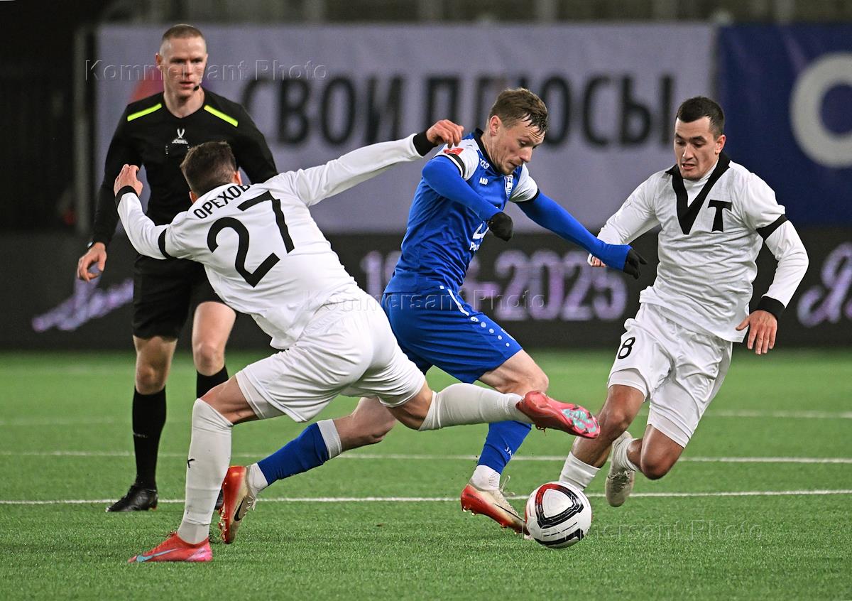 Фонбет - Кубок России по футболу 2025/26. 1/4 финала. Матч между командами "Торпедо" (Москва) - "Балтика" (Калининград) на стадионе "Арена Химки". Игрок команды "Балтика" Юрий Ковалев (в центре), игроки команды "Торпедо" Александр Орехов (слева) и Артур Галоян (справа) во время матча.