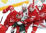 Континентальная Хоккейная Лига (КХЛ). Матч между командами "Спартак" (Москва) - "Ак Барс" (Казань) на стадионе "Мегаспорт". Игрок команды "Ак Барс" Илья Карпухин (в центре) во время матча.