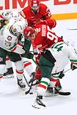 Континентальная Хоккейная Лига (КХЛ). Матч между командами "Спартак" (Москва) - "Ак Барс" (Казань) на стадионе "Мегаспорт". Игрок команды "Спартак" Александр Беляев (слева) и игрок команды "Ак Барс" Илья Карпухин (справа) во время матча.