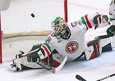 Континентальная Хоккейная Лига (КХЛ). Матч между командами "Спартак" (Москва) - "Ак Барс" (Казань) на стадионе "Мегаспорт". Вратарь команды "Спартак" Артем Загидулин (слева) во время матча.