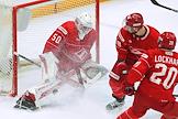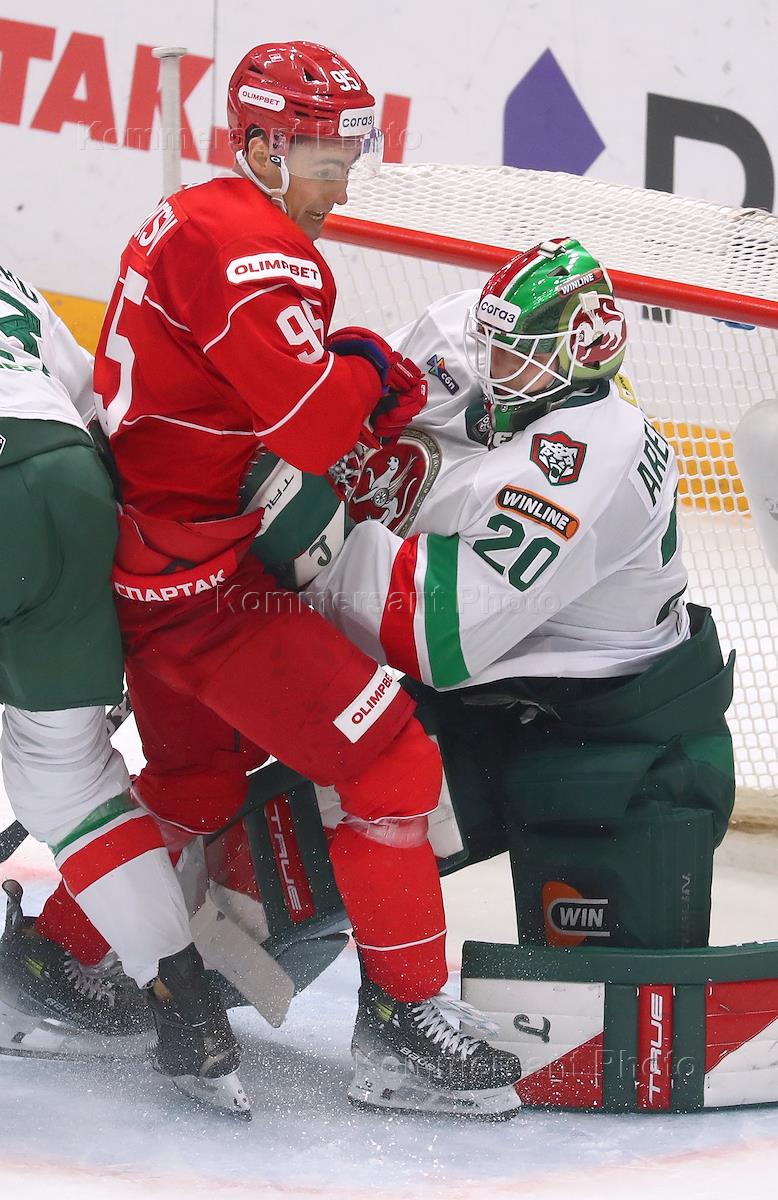 Континентальная Хоккейная Лига (КХЛ). Матч между командами "Спартак" (Москва) - "Ак Барс" (Казань) на стадионе "Мегаспорт". Игрок команды "Спартак" Герман Рубцов (слева) и вратарь команды "Ак Барс" Максим Арефьев (справа) во время матча.