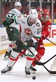 Континентальная Хоккейная Лига (КХЛ). Матч между командами "Спартак" (Москва) - "Ак Барс" (Казань) на стадионе "Мегаспорт". Игрок команды "Спартак" Павел Порядин (слева) и игрок команды "Ак Барс" Алексей Марченко (справа) во время матча.