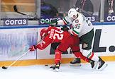 Континентальная Хоккейная Лига (КХЛ). Матч между командами "Спартак" (Москва) - "Ак Барс" (Казань) на стадионе "Мегаспорт". Игрок команды "Спартак" Никита Коростелев (справа) и игрок команды "Ак Барс" Илья Карпухин (слева) во время матча.
