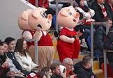 Континентальная Хоккейная Лига (КХЛ). Матч между командами "Спартак" (Москва) - "Ак Барс" (Казань) на стадионе "Мегаспорт". Жанровая фотография. Ростовые куклы поросята на трибуне стадиона во время матча.