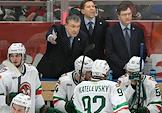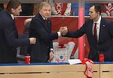 Континентальная Хоккейная Лига (КХЛ). Матч между командами "Спартак" (Москва) - "Ак Барс" (Казань) на стадионе "Мегаспорт". Главный тренер команды "Спартак" Алексей Жамнов (в центре) во время матча.