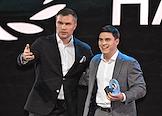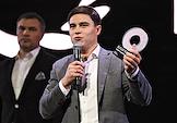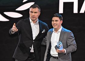 II Церемония вручения профессиональной премии блогеров "Блогема" в киноконцертном комплексе "Мосфильм". Спортивный комментатор, боксер, чемпион мира среди профессионалов по версии WBC Григорий Дрозд (слева) и президент Всероссийской федерации фиджитал-спорта, олимпийский чемпион Никита Нагорный (справа) на церемонии.