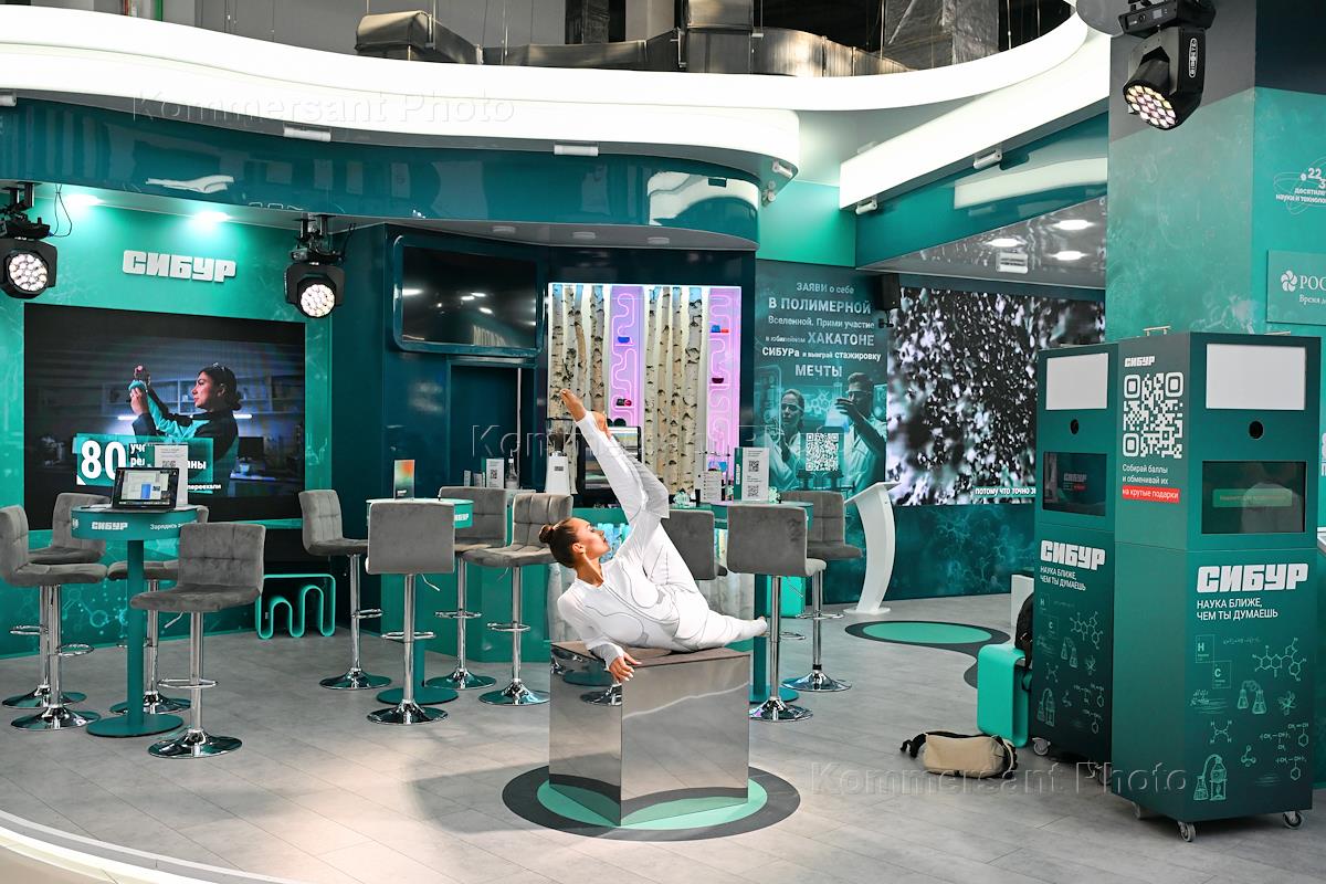 V Конгресс молодых ученых (КМУ)-2025 на федеральной территории "Сириус". Жанровая фотография. Стенд компании "Сибур" на выставке научных достижений.