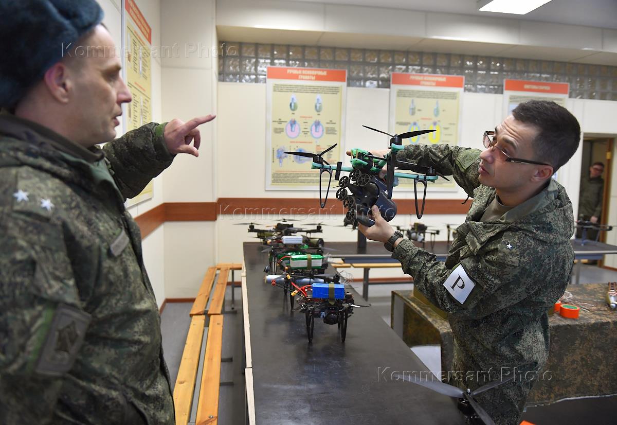 Подготовка операторов ударных и разведывательных БПЛА коптерного типа на базе учебного центра Ленинградского военного округа. Учащиеся во время занятий по управлению БПЛА в классе.