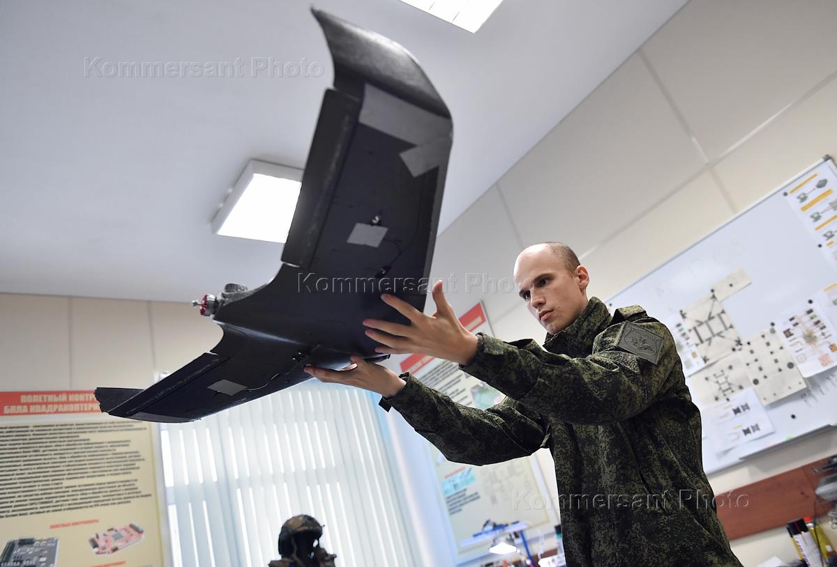 Подготовка операторов ударных и разведывательных БПЛА коптерного типа на базе учебного центра Ленинградского военного округа. Учащиеся во время занятий по управлению БПЛА в классе.