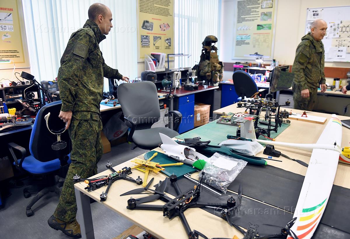 Подготовка операторов ударных и разведывательных БПЛА коптерного типа на базе учебного центра Ленинградского военного округа. Учащиеся во время занятий по управлению БПЛА в классе.