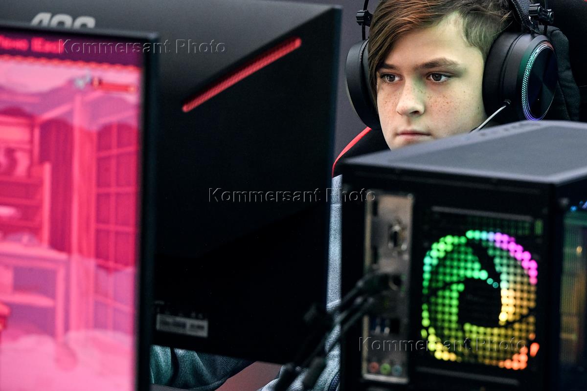"Московская международная неделя видеоигр" в инновационном центре "Сколково". Жанровая фотография. Участник недели во время игры на компьютере.