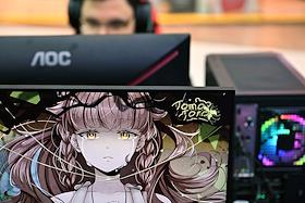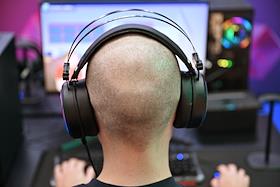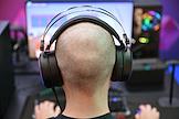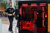 "Московская международная неделя видеоигр" в инновационном центре "Сколково". Жанровая фотография. Участник недели во время игры на компьютере.