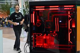 "Московская международная неделя видеоигр" в инновационном центре "Сколково". Жанровая фотография. Световая клавиатура компьютера.