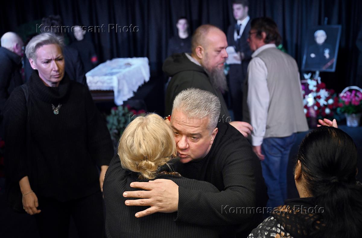 Церемония прощания с артистом Всеволодом Шиловским в Московском Театре-студии Всеволода Шиловского. Актеры Ольга Кабо (слева) и Виктор Раков (справа) на церемонии.