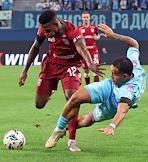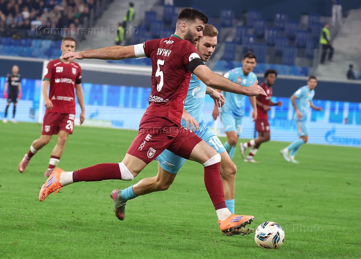 Мир Российская Премьер-Лига (РПЛ) 2025/2026. 17-й тур. Матч между командами "Зенит" (Санкт-Петербург) - "Рубин" (Казань) на стадионе "Газпром Арена". Игрок команды "Рубин" Егор Тесленко (слева) во время матча.