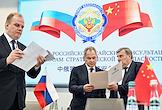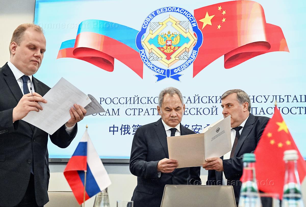 Секретарь Совета безопасности России Сергей Шойгу (в центре) во время встречи с министром иностранных дел Китайской Народной республики Ваном И.