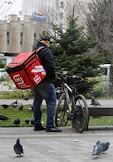 Виды города Волжский. Жанровая фотография. Курьер службы доставки сети розничных магазинов "Магнит" в городском сквере.