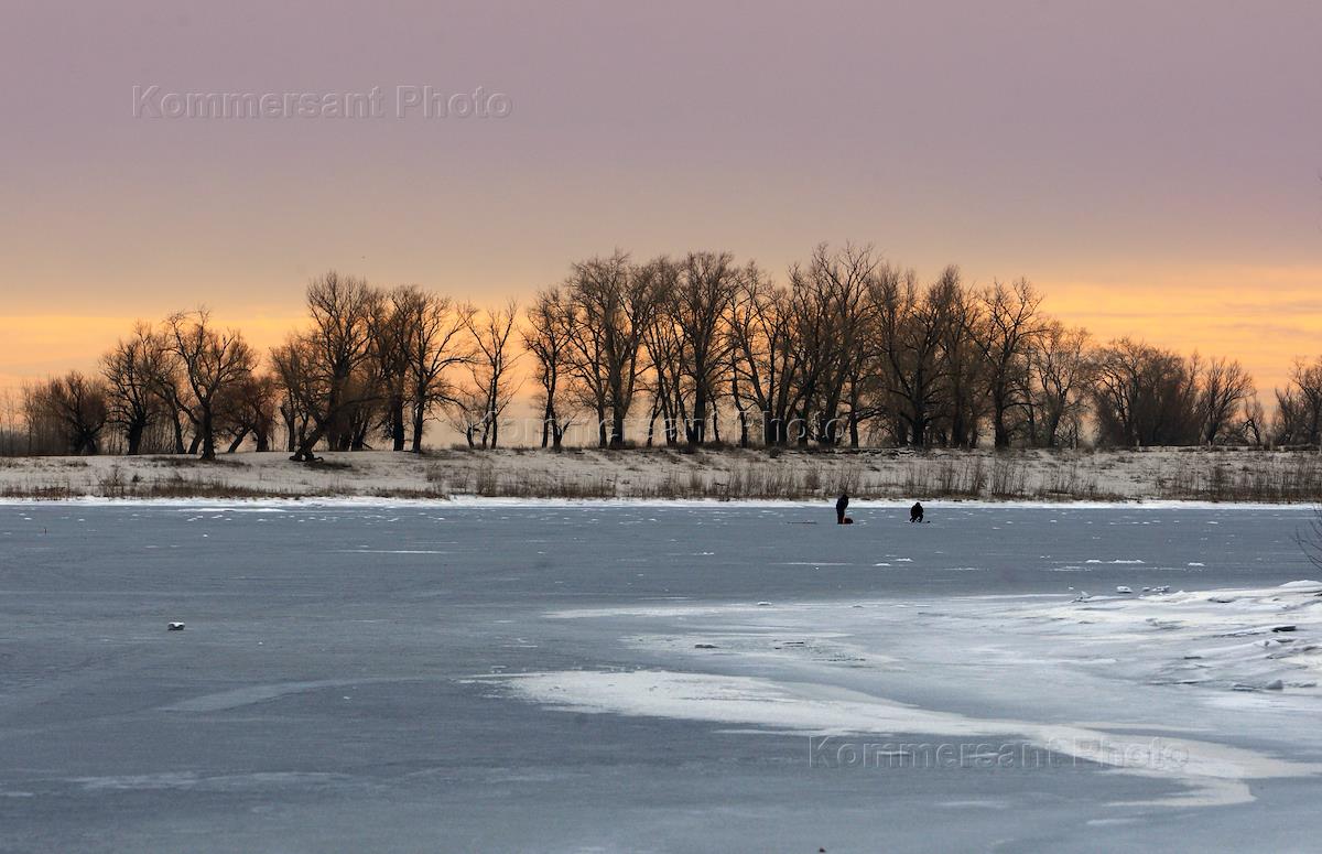 Жанровая фотография. Виды Волжского. Рыбаки на льду реки Ахтуба.