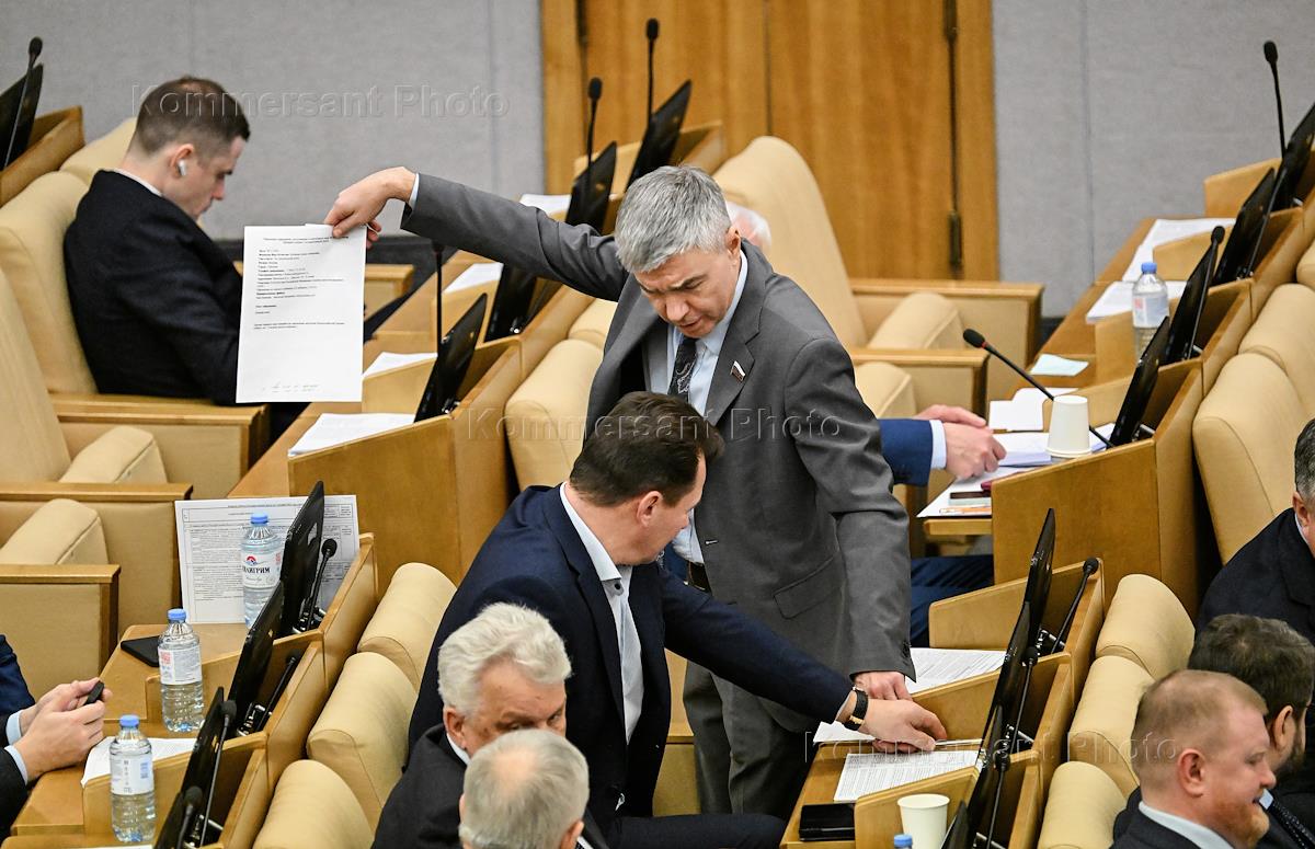 Пленарное заседание Государственной думы (ГД) России. Первый заместитель председателя комитета ГД России по транспорту и развитию инфраструктуры Павел Федяев (в центре) во время заседания.