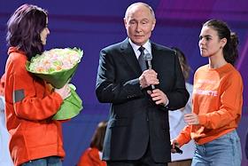 Пятый Международный форум гражданского участия #МЫВМЕСТЕ в Национальном центре "Россия". Церемония награждения Международной премии #МЫВМЕСТЕ. Президент России Владимир Путин (справа) и победительница премии "Волонтер года - 2025" Анна Плужникова (слева) на церемонии.