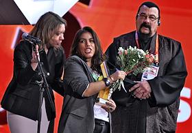 Пятый Международный форум гражданского участия #МЫВМЕСТЕ в Национальном центре "Россия". Церемония награждения Международной премии #МЫВМЕСТЕ. Слева направо: генеральный директор Национального центра "Россия" Наталья Виртуозова, руководитель Фонда Reciclando un mundo mejor (Колумбия) Алехандра Бонито и американский актер Стивен Сигал на церемонии.