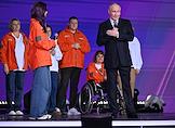 Пятый Международный форум гражданского участия #МЫВМЕСТЕ в Национальном центре "Россия". Церемония награждения Международной премии #МЫВМЕСТЕ. Президент России Владимир Путин (справа) на церемонии.