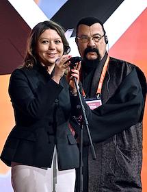 Пятый Международный форум гражданского участия #МЫВМЕСТЕ в Национальном центре "Россия". Церемония награждения Международной премии #МЫВМЕСТЕ. Генеральный директор Национального центра "Россия" Наталья Виртуозова (слева) и американский актер Стивен Сигал (справа) на церемонии.