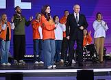 Пятый Международный форум гражданского участия #МЫВМЕСТЕ в Национальном центре "Россия". Церемония награждения Международной премии #МЫВМЕСТЕ. Президент России Владимир Путин (в центре) и победительница премии "Волонтер года - 2025" Анна Плужникова (слева) на церемонии.