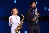 Пятый Международный форум гражданского участия #МЫВМЕСТЕ в Национальном центре "Россия". Церемония награждения Международной премии #МЫВМЕСТЕ. Саксофонисты Вероника Кожухарова (слева) и Армир Ли на церемонии.