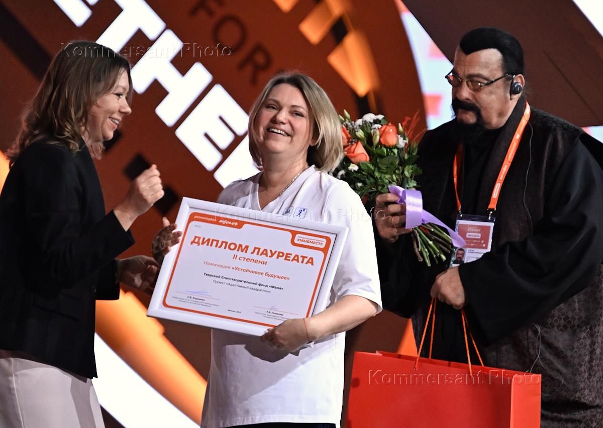 Пятый Международный форум гражданского участия #МЫВМЕСТЕ в Национальном центре "Россия". Церемония награждения Международной премии #МЫВМЕСТЕ. Слева направо: генеральный директор Национального центра "Россия" Наталья Виртуозова, директор по развитию Тверского областного общественного благотворительного фонда содействия защите материнства и детства "Мама", руководитель проектов "Сила спорта" и "Второе дыхание" Наталья Храповицкая и американский актер Стивен Сигал на церемонии.