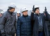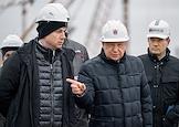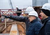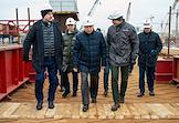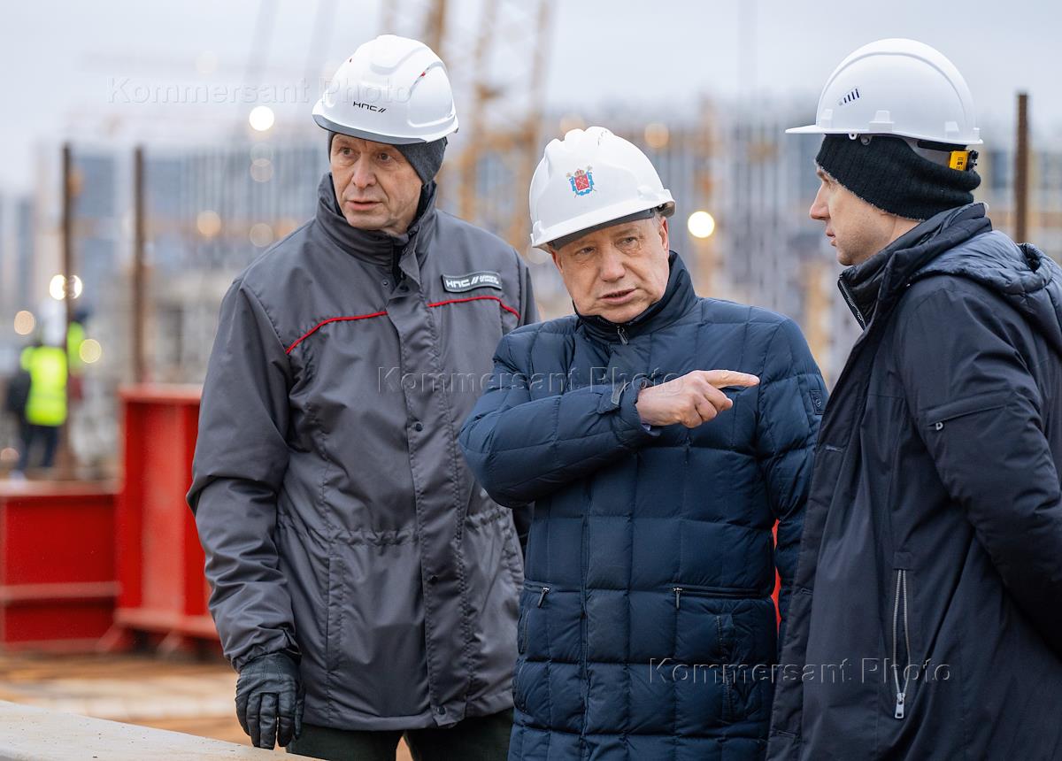 Строительная площадка Большого Смоленского моста через реку Неву. Губернатор Санкт-Петербурга Александр Беглов (в центре) во время посещения площадки.