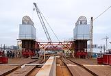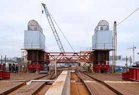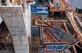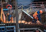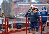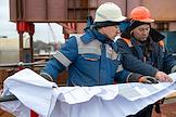 Строительная площадка Большого Смоленского моста через реку Неву. Жанровая фотография. Сотрудники компании "Дороги и мосты" на площадке.