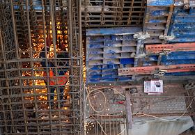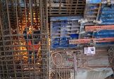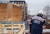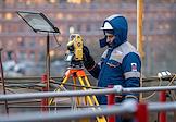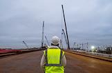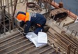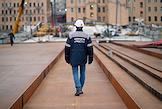 Строительная площадка Большого Смоленского моста через реку Неву. Жанровая фотография. Сотрудник компании "Дороги и мосты" на площадке.