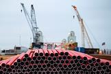 Строительная площадка Большого Смоленского моста через реку Неву. Жанровая фотография. Пластиковые трубы.