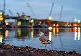 Строительная площадка Большого Смоленского моста. Жанровая фотография. Птица на берегу реки Невы.