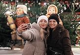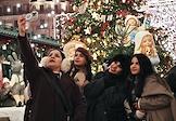 Виды вечерней Москвы. Жанровая фотография. Новогоднее убранство города. Площадка Фестиваля "Московские сезоны" на Манежной площади. Женщины фотографируются у новогодней елки.