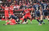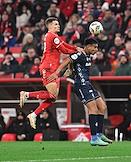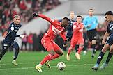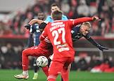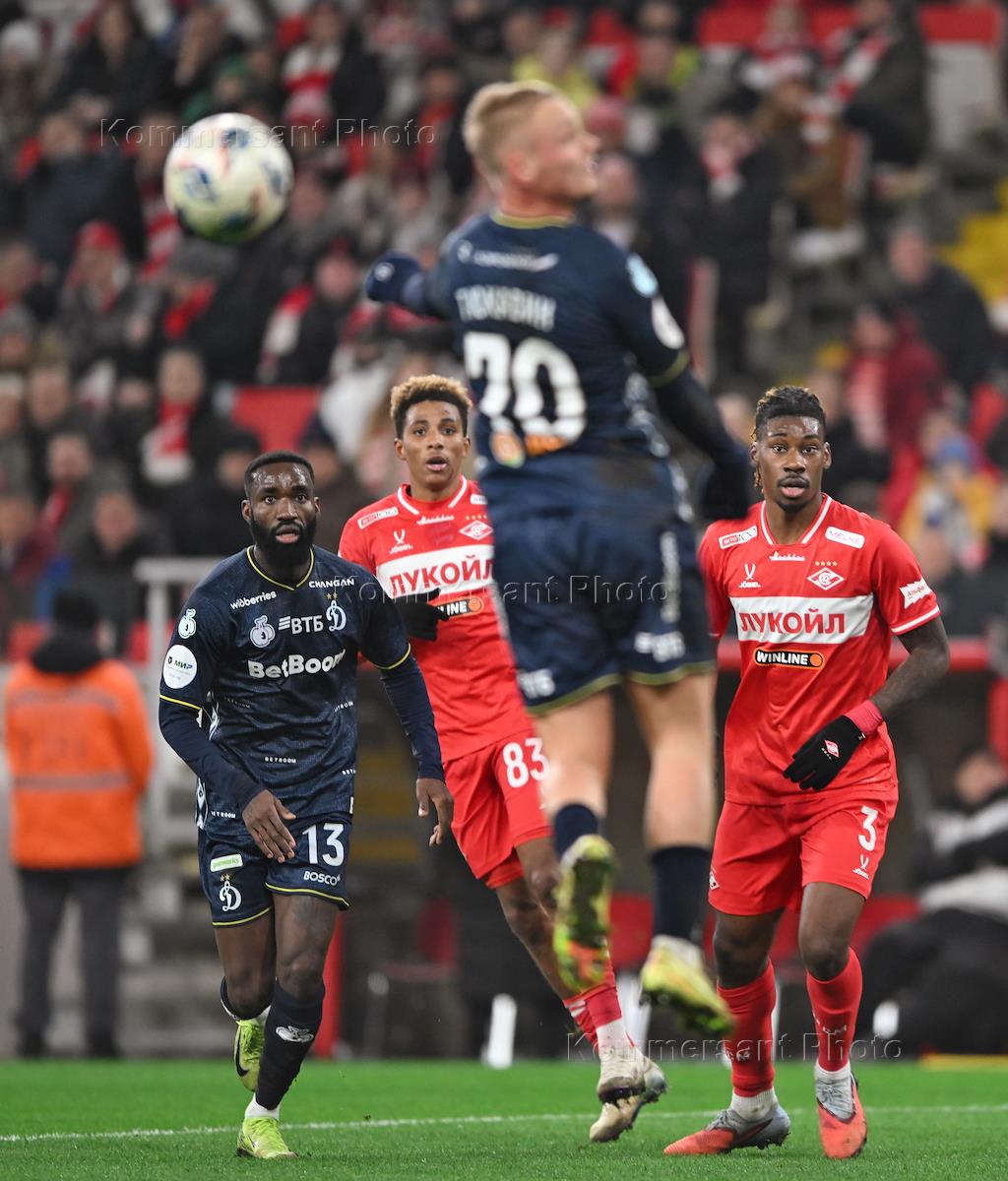 Мир Российская Премьер-Лига (РПЛ) 2025/2026. 18-й тур. Матч между командами "Спартак" (Москва) - "Динамо М" (Москва) на стадионе "Лукойл Арена". Игроки команды "Спартак" Жедсон Фернандеш (второй слева), Кристофер Ву (справа) и игрок команды "Динамо" Муми Нгамале (слева) во время матча.