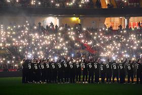 Мир Российская Премьер-Лига (РПЛ) 2025/2026. 18-й тур. Матч между командами "Спартак" (Москва) - "Динамо М" (Москва) на стадионе "Лукойл Арена". Акция в память о футболисте Никите Симоняне перед началом матча.