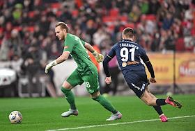 Мир Российская Премьер-Лига (РПЛ) 2025/2026. 18-й тур. Матч между командами "Спартак" (Москва) - "Динамо М" (Москва) на стадионе "Лукойл Арена". Вратарь команды "Спартак" Александр Максименко (слева) и игрок команды "Динамо" Ярослав Гладышев (справа) во время матча.
