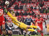 Мир Российская Премьер-Лига (РПЛ) 2025/2026. 18-й тур. Матч между командами "Спартак" (Москва) - "Динамо М" (Москва) на стадионе "Лукойл Арена". Вратарь команды "Динамо" Андрей Лунев (справа) и игрок команды "Спартак" Ливай Гарсия (слева) во время матча.