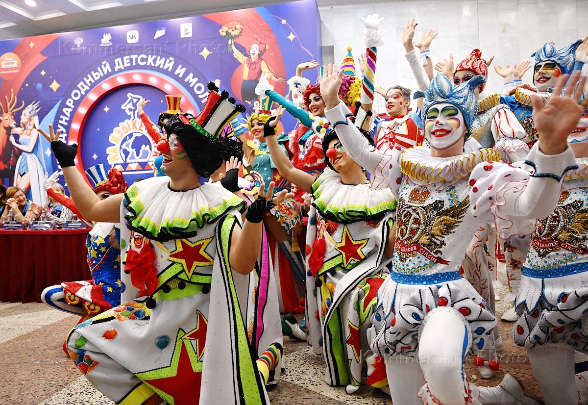 V Международный детский и молодежный фестиваль циркового искусства "На языке мира" на арене Тульского государственного цирка. Клоунский дуэт "МИК И PRINCIPESSA" (Николай Кормильцев (справа) и Мария Кремель (слева), Большой московский государственный цирк) во время выступления на фестивале.