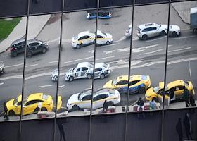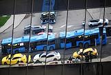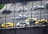 Виды Москвы. Отражение городского транспорта в зеркальном фасаде торгового центра "Щёлковский". Жанровая фотография.