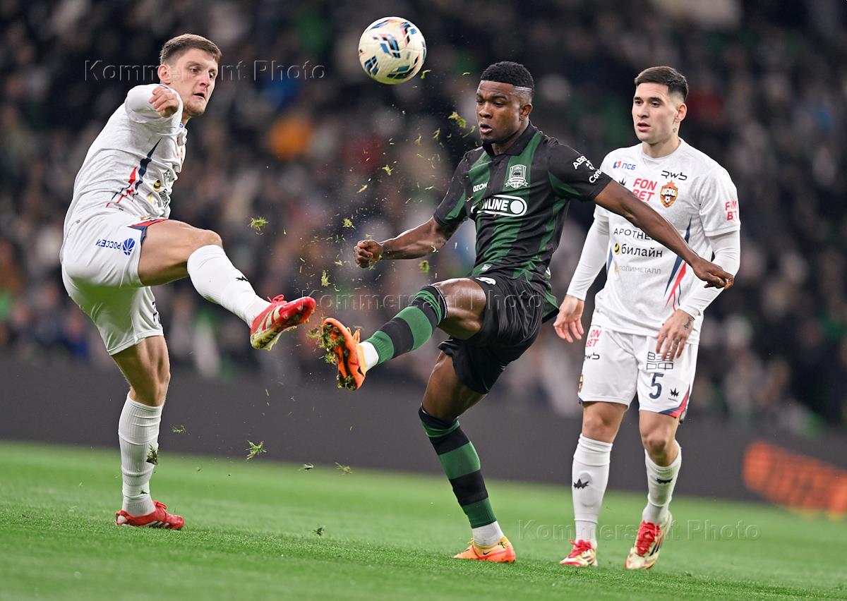 Мир Российская Премьер-Лига (РПЛ) 2025/2026. 18-й тур. Матч между командами "Краснодар" (Краснодар) - ЦСКА (Москва) на стадионе "Ozon Арена". Игрок команды "Краснодар" Джон Кордоба (в центре) и игрок команды ЦСКА Игорь Дивеев (слева) во время матча.