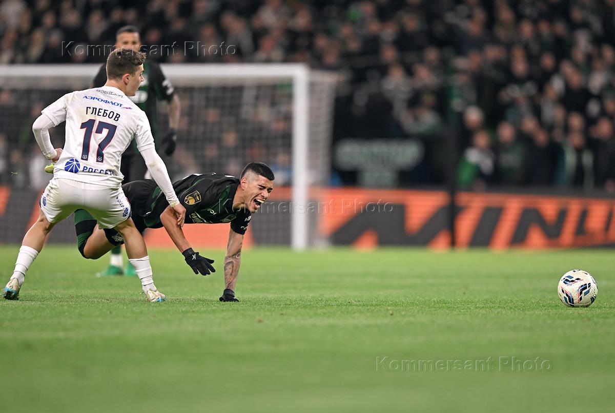 Мир Российская Премьер-Лига (РПЛ) 2025/2026. 18-й тур. Матч между командами "Краснодар" (Краснодар) - ЦСКА (Москва) на стадионе "Ozon Арена". Игрок команды "Краснодар" Лукас Оласа (справа) и игрок команды ЦСКА Кирилл Глебов (слева) во время матча.