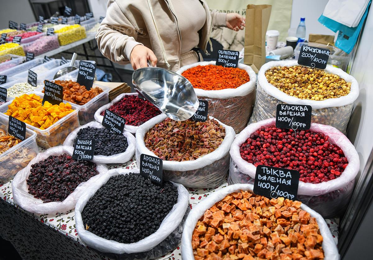 Краевая ярмарка свежих продуктов в МВДЦ "Сибирь". Жанровая фотография. Сушеные ягоды и фрукты на прилавке.