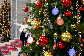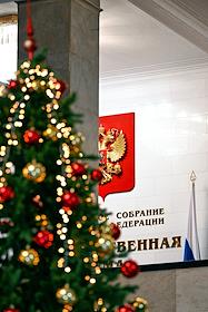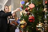 Церемония открытия ежегодной всероссийской акции "Елка желаний" с участием представителей всех фракций Государственной думы (ГД) России. Жанровая фотография. Новогодняя елка в фойе ГД России.
